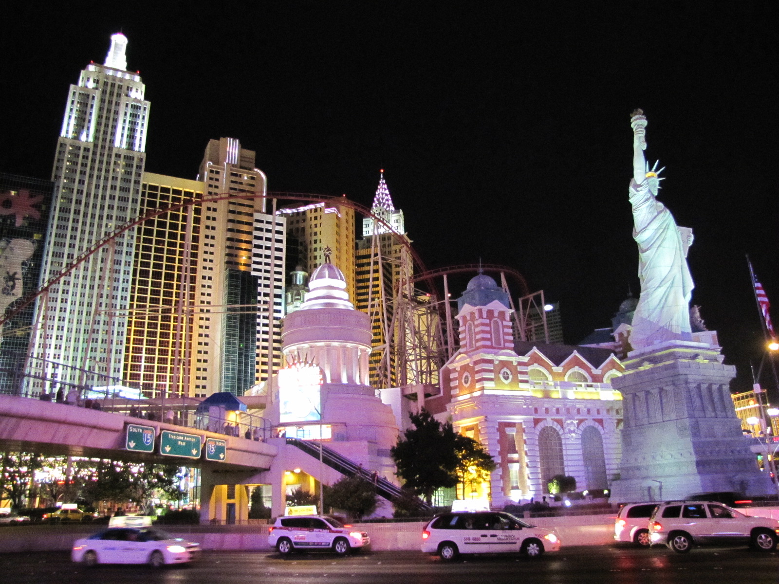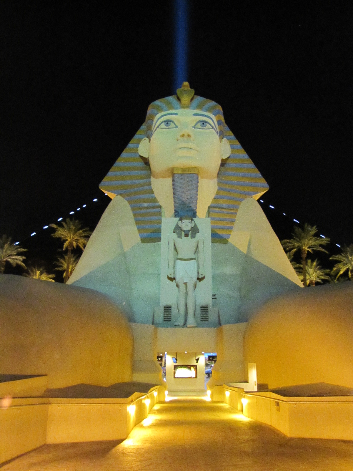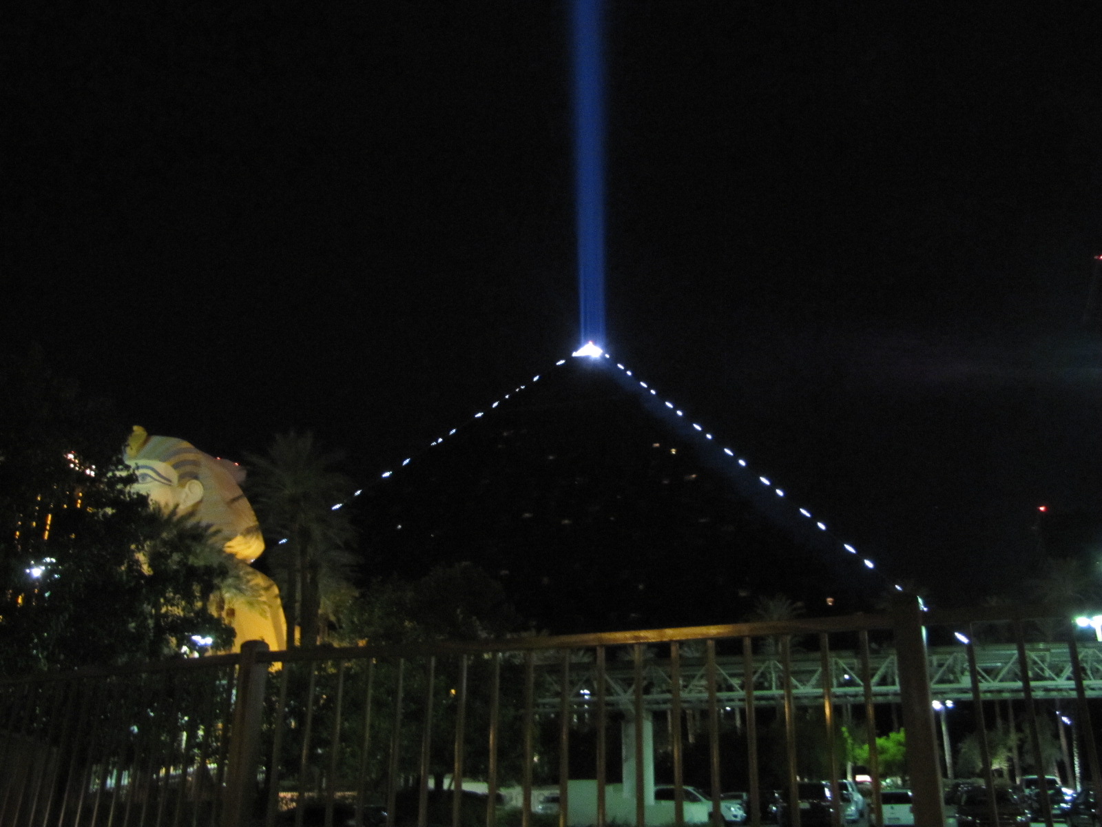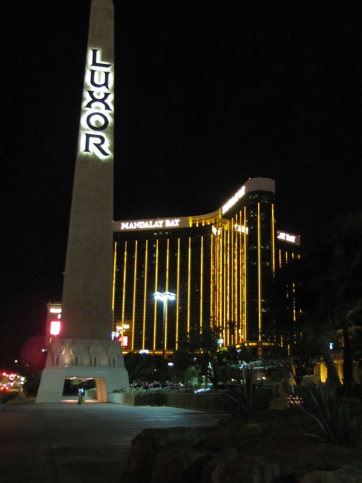 Encore 40 Miles en partant du barrage et au détour d’un virage, nous voyons enfin la ville « lumière », à perte de vue, tout est illuminé, vers le sud de la ville où nous guide notre GPS, nous apercevons bien sur le laser géant de notre destination finale : le LUXOR !