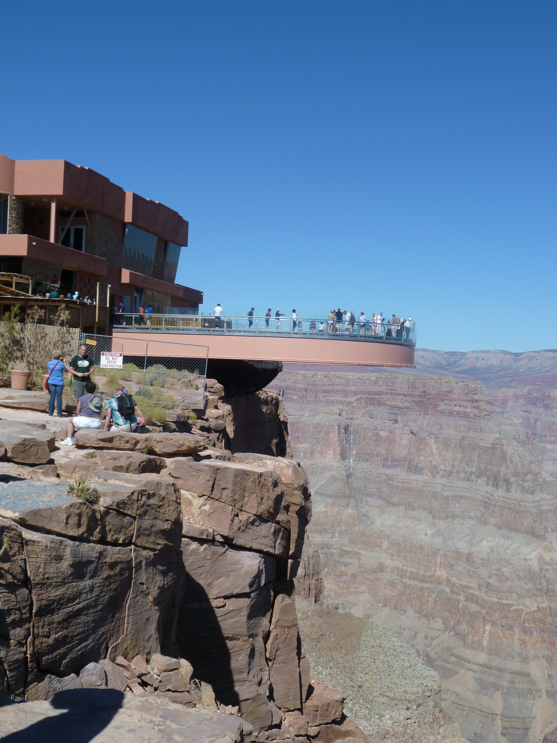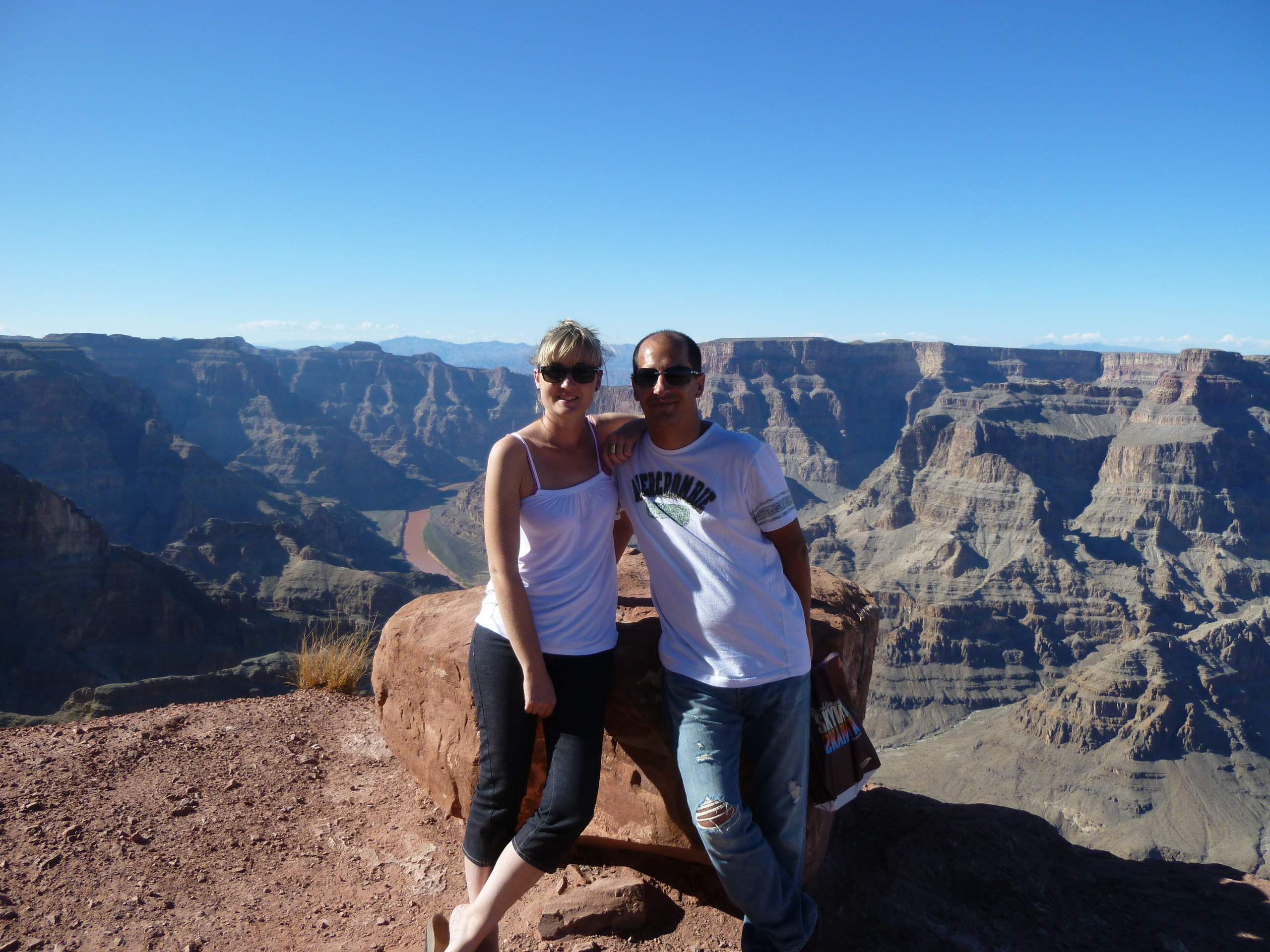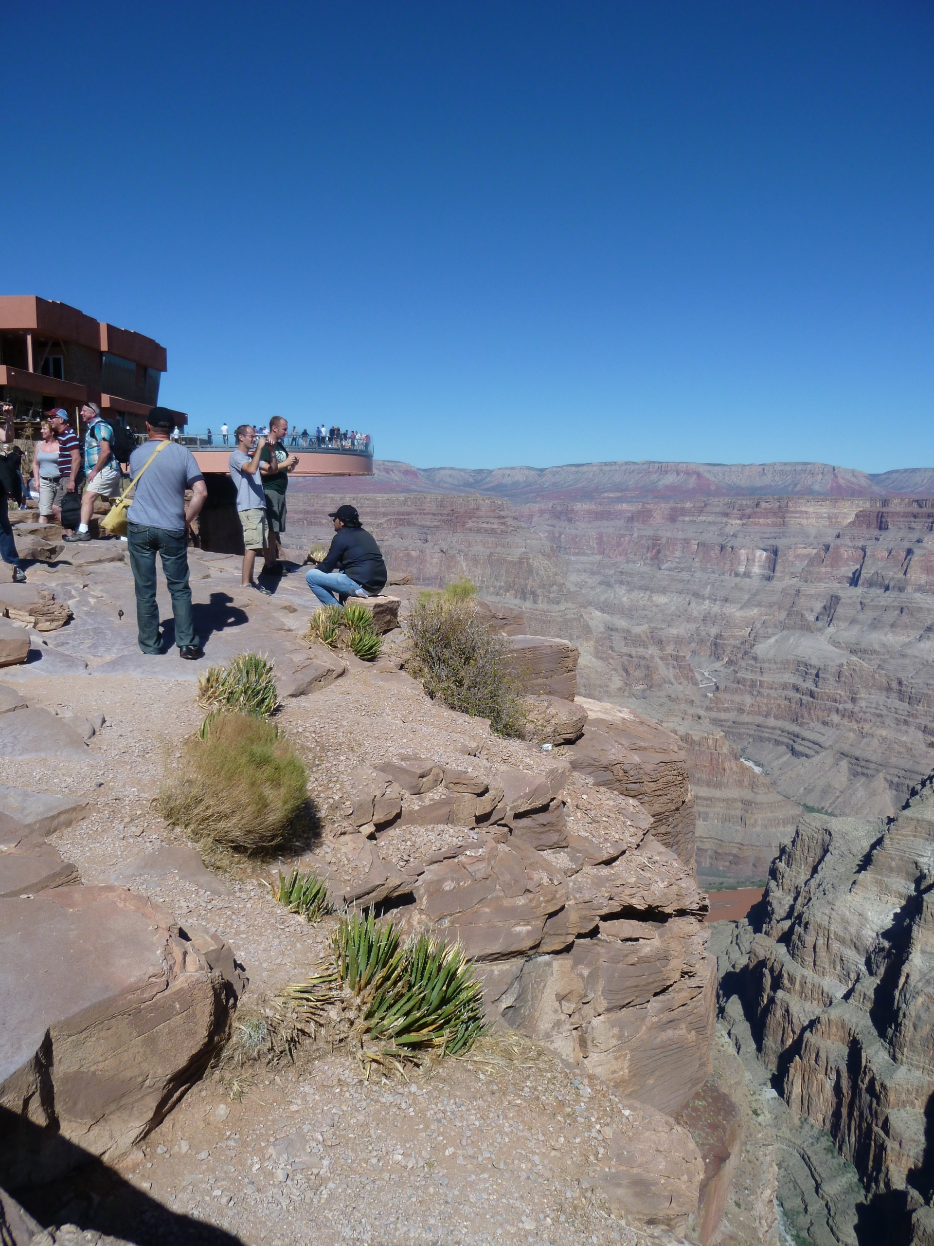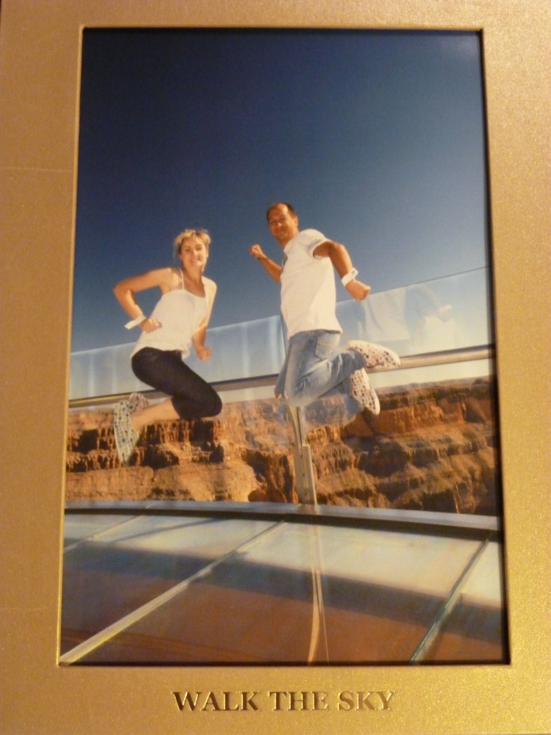 Photographe officiel trouvé, nous commençons donc la séance photo sur ses conseils, ca passe d’une photo debout devant le grand canyon, suivent ensuite les photos couchées par terre au dessus du vide, et LA photo que nous avons sélectionnée : un saut dans le vide. (à 30 dollars la photo avec un petit certificat à remplir soit même comme quoi nous avons monté sur la passerelle …)