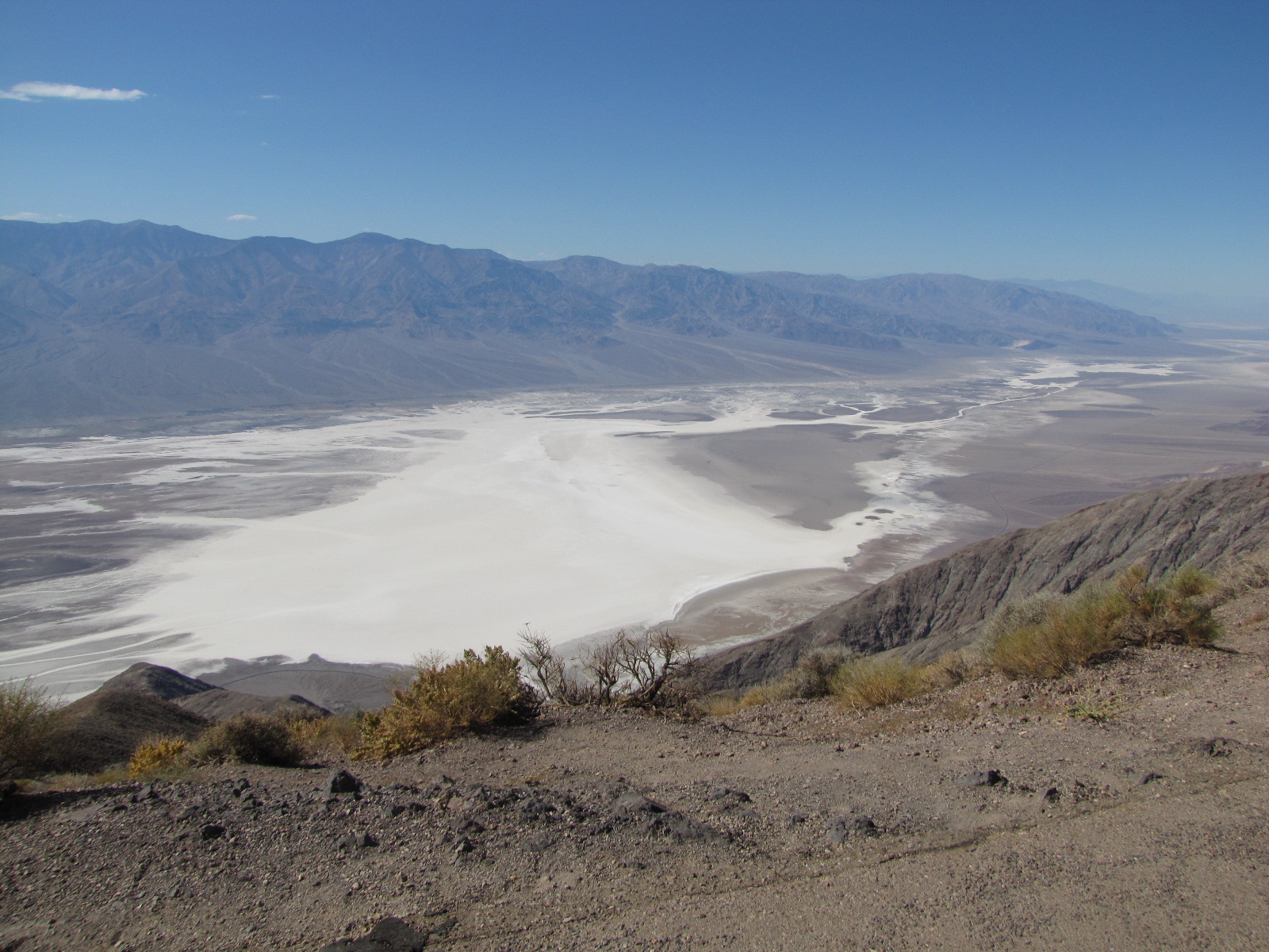 Premier arrêt à 1600 mètres de hauteur a « dante’s view » un pic qui domine la vallée de la mort et qui offre une vue superbe sur la mer de sel en dessous, une route interdite aux caravanes notamment sur la fin du parcours avec une pente à 15° sur environ 700 Mètres …