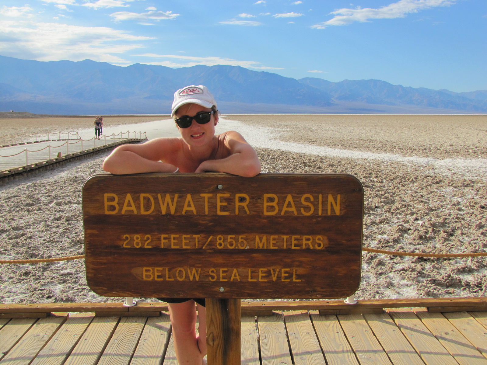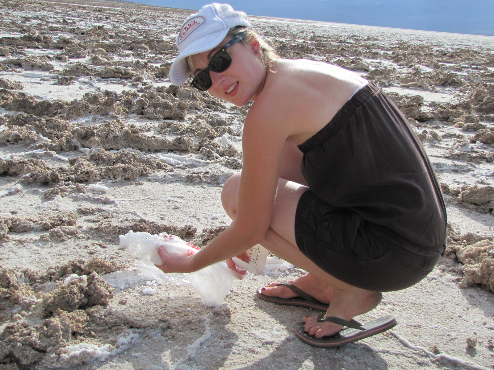 La température pour nous était de 100° F tout rond … un petit 37° juste assez supportable pour aller se promener sur la mer de sel, sensation bizarre d’être sur un glacier sans le froid, le peu d’eau qui subsiste sous le sel n’est pas « goutable » car elle contient juste 4 fois la dose de sel de l’océan … d’ou le nom du site : « mauvaises eaux »