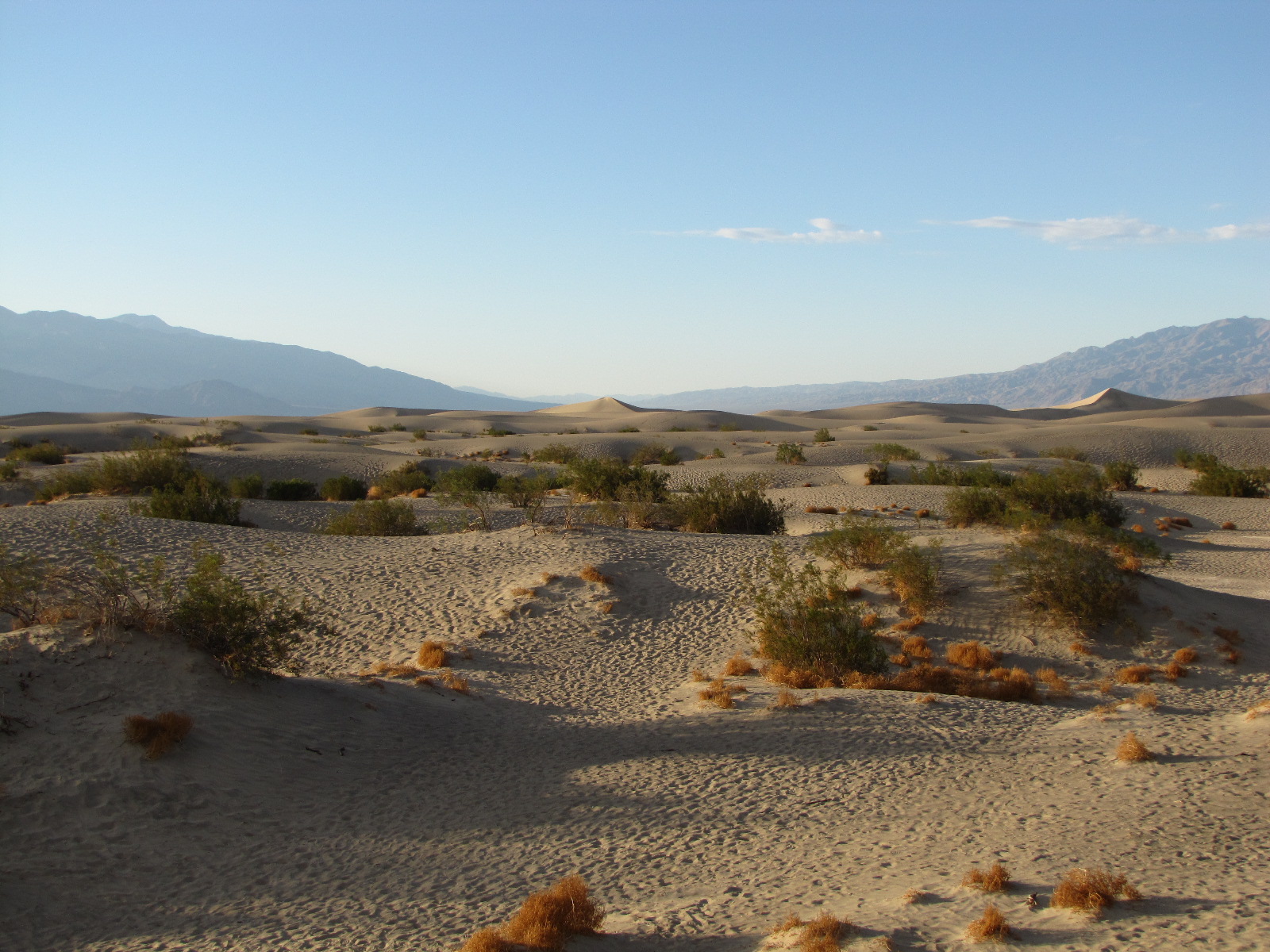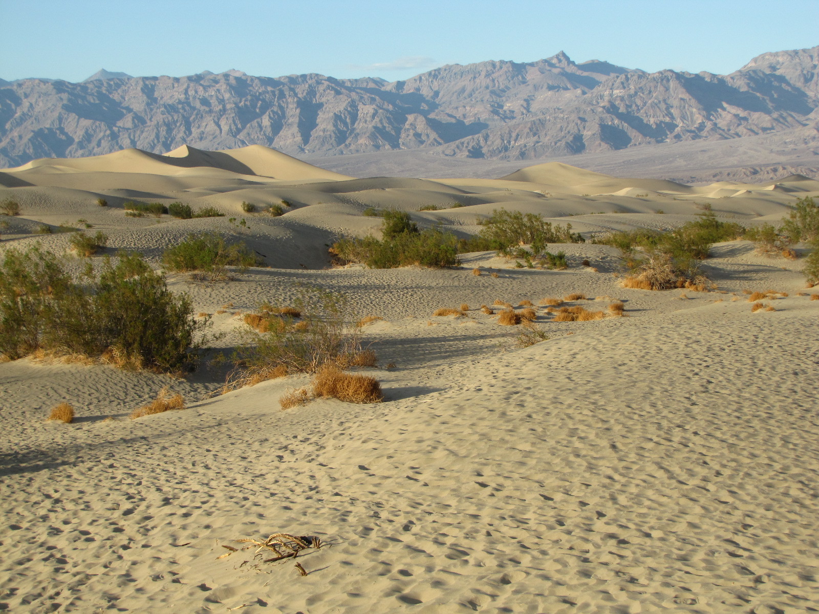 Nous arrivons donc aux dunes de sables de Stovepipe Wells en fin d’après midi, la description est simple, il s’agit d’un desert de sable (assez rare pour être noté aux USA où les deserts sont composés de cailloux). L’explication scientifique est que le sable vient de l’érosion des montagnes aux alentours et qu’il reste coincé dans cette vallée par la force de deux vents (venant du sud et du nord) qui s’opposent en permanence faisant que les dunes se déplacent dans la vallée mais ne peuvent pas en sortir … La chaleur de la journée nous permettra d’éviter la faune locale qui ne sort qu’avec la nuit et la fraicheur … Nous éviterons donc dans le désordre les crotales, coyotes et rat-kangourous qui fréquentent ce désert …