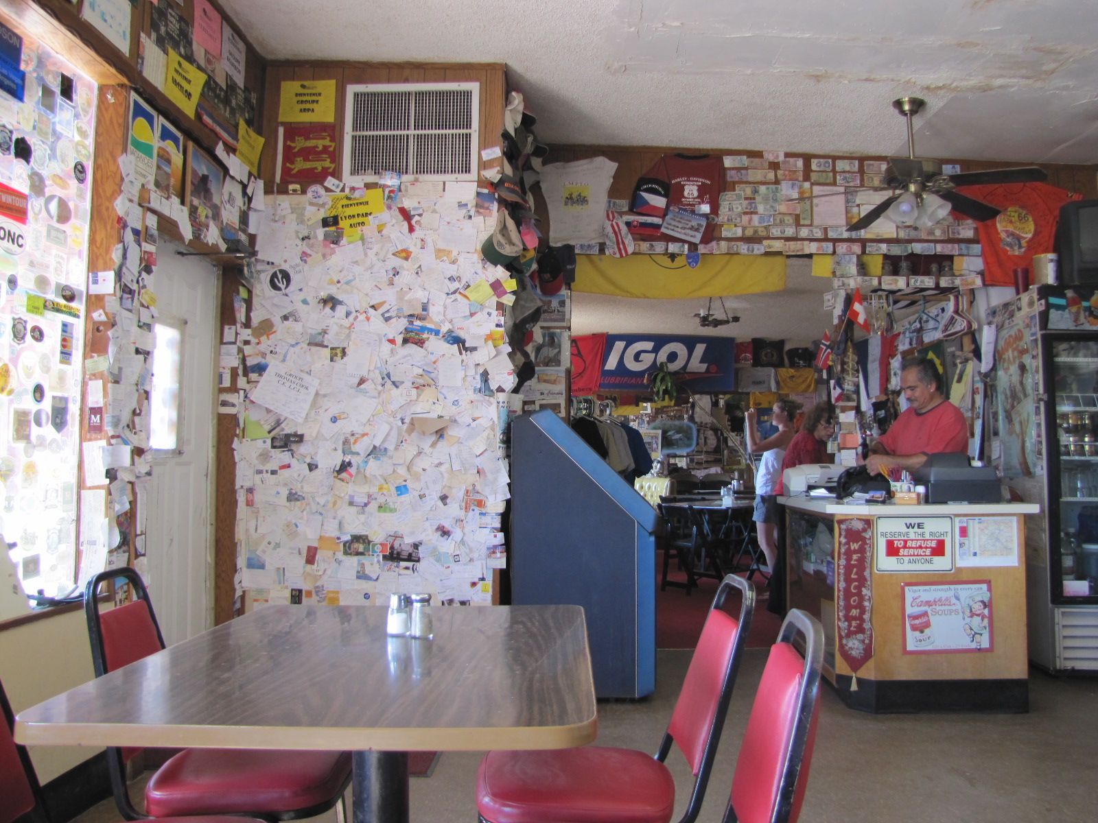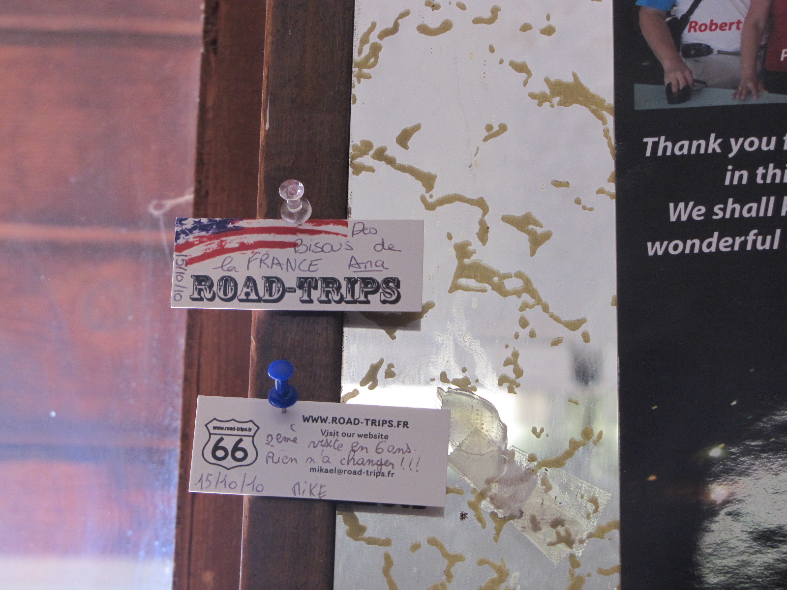 Hamburger au chili pour anais (on à repéré les milk shake fait maison qu’après …) séance photo devant et derrière le comptoir, cartes de visites et stickers road-trip.fr collés au mur et on repart.