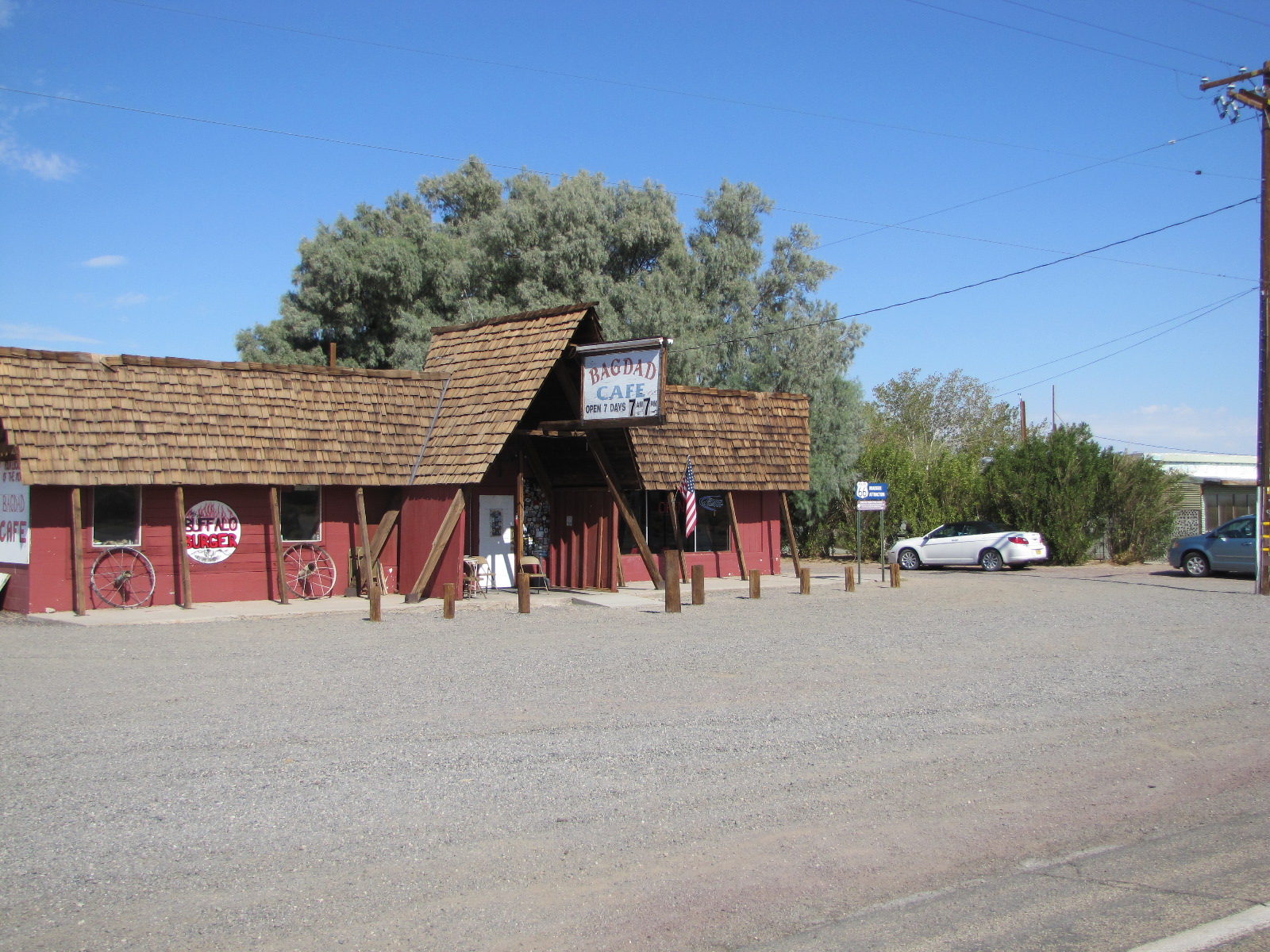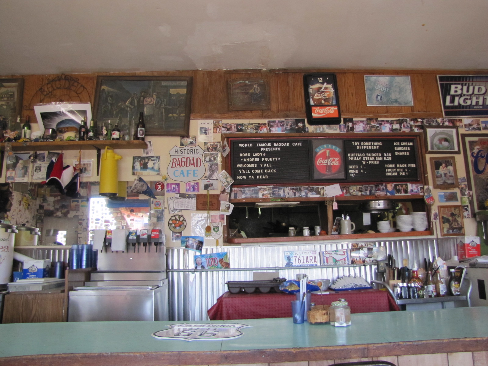 Sortie du Nevada et du grand Canyon, direction la Californie, un grand bout de desert sur autoroute pour arriver sur la version californienne de la route 66 et pause dej au mythique Bagdad café. 3 générations se bousculent derrière le comptoir, avec le couple qui tient le resto, les enfants et la petite dernière qui ne marche pas encore et qui déjà écoute 20 fois par jour la chanson du film (qui se met en route sur le jukebox à chaque client qui rentrer …)