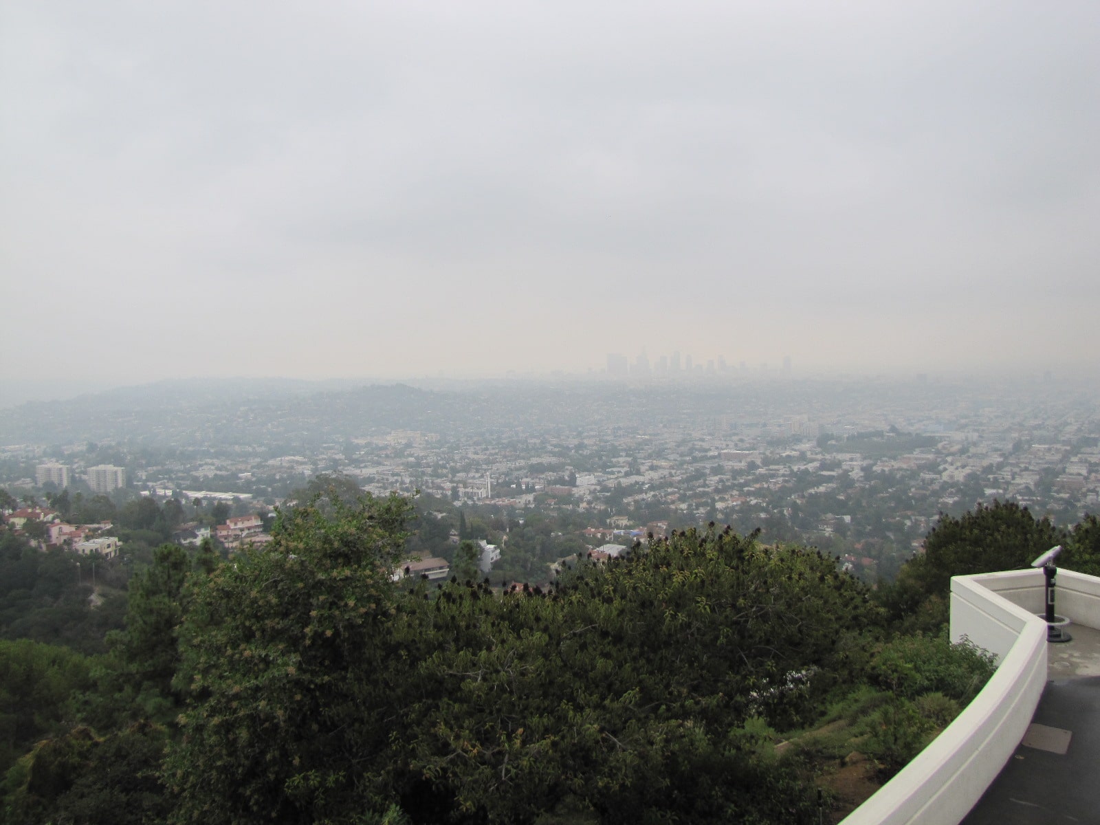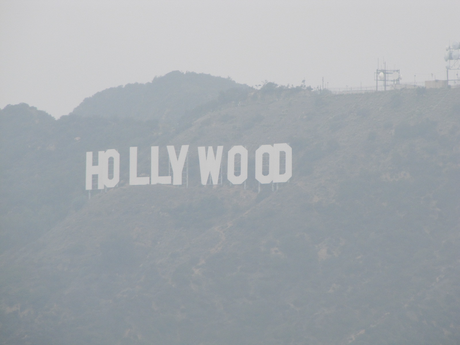 Pas de chance pour nous, la météo est à la brume (et pas à la pollution jaune qui recouvre Los Angeles d’habitude) donc nous n’aurons qu’une vue très partielle du signe Hollywood et nous devinerons la ville plus que nous ne la verrons … Dommage mais bon quand ca ne veut pas, ca veut pas !!