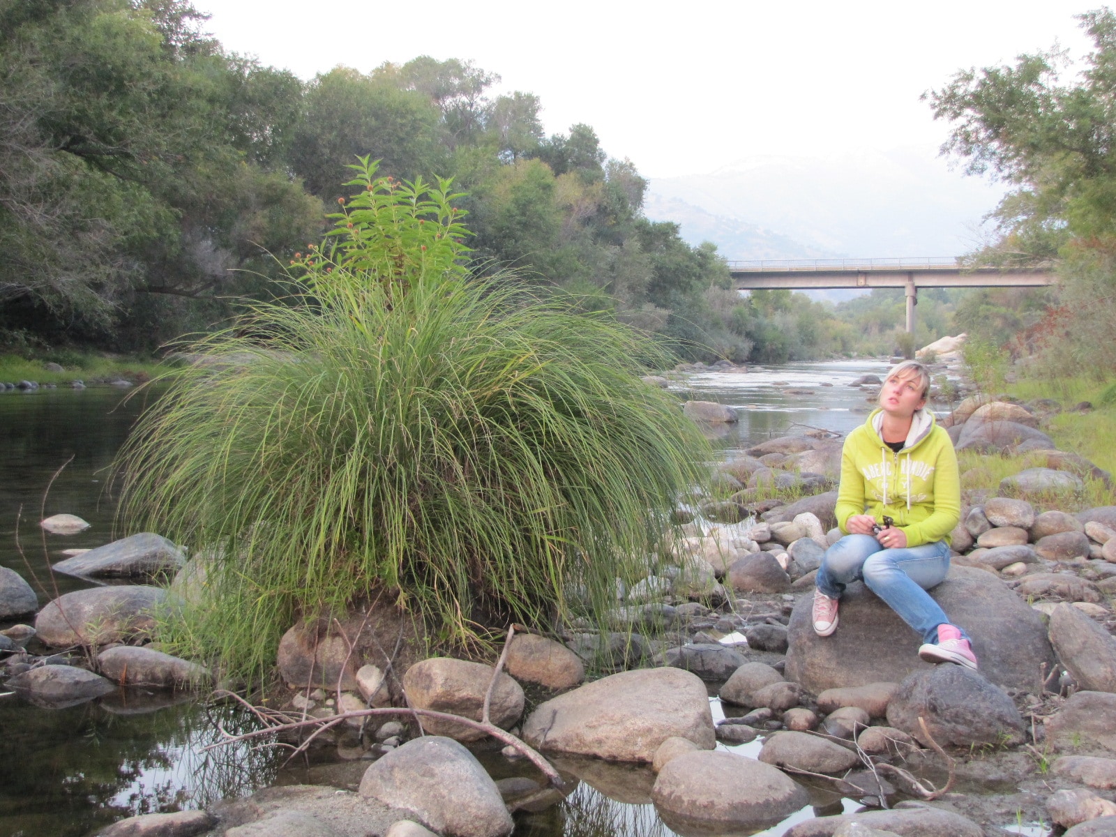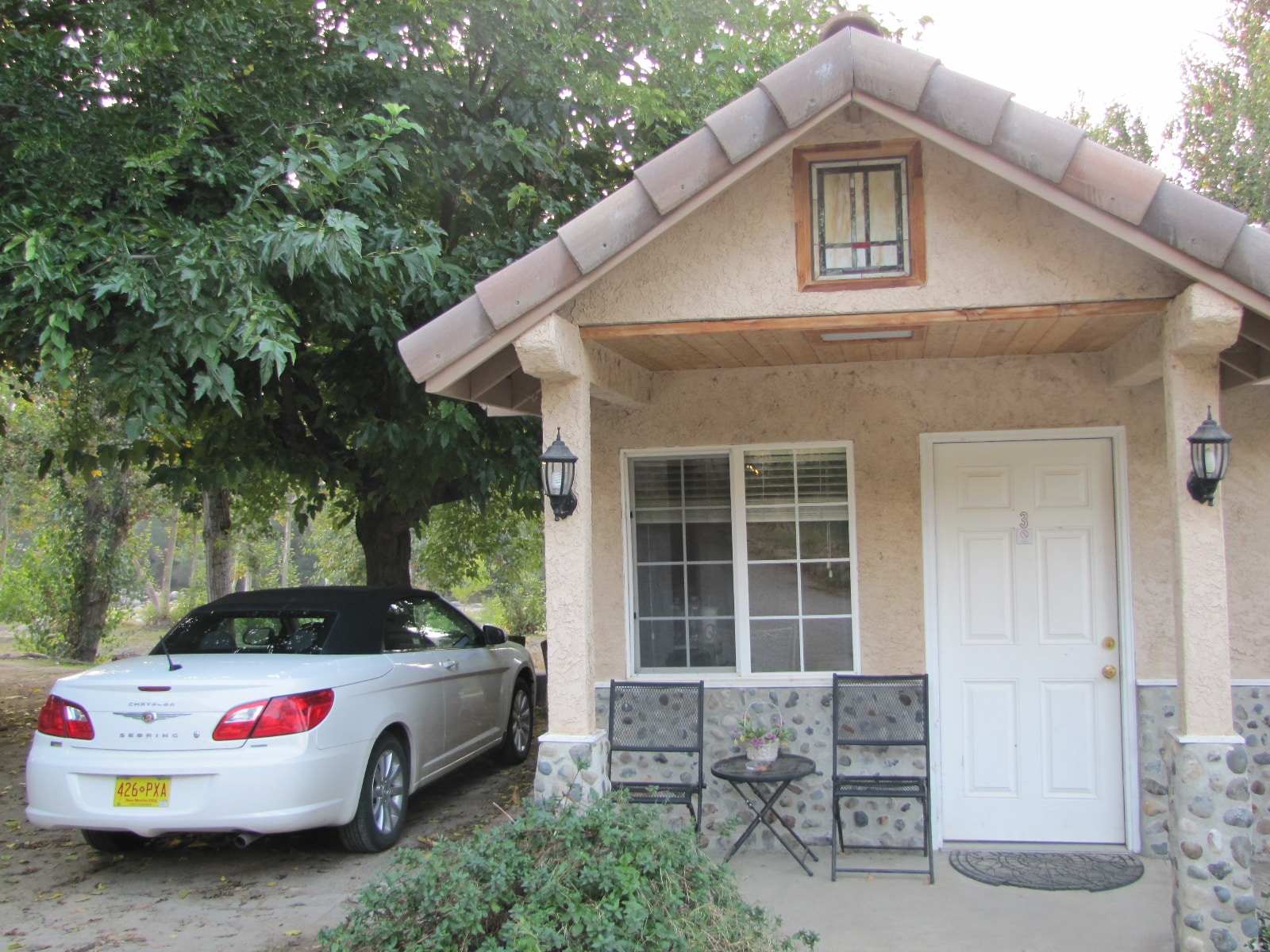 Nous avons un frigo, un micro onde, une mini cafetière et l’eau fournit pour la douche et les toilettes est issu directement de la rivière à priori (via un ballon d’eau chaude quand même) l’intérieur du chalet est en bois avec une charmante terrasse qui donne directement sur la rivière qui passe à côté. Et dans ce coin de la Californie, le soleil est encore présent aujourd’hui !!! Enfin on peut profiter de notre terrasse au soleil sans avoir l’écharpe sous le nez …
