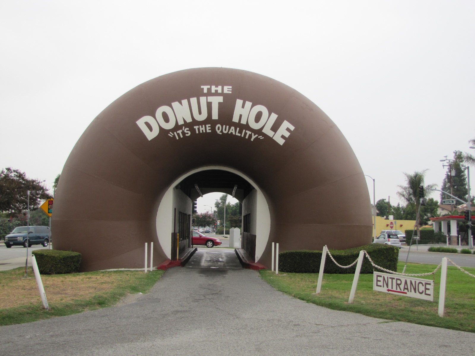 Après avoir fait quelques achats et tester une chaine de fast food chinoise où du coup notre accent français n’était pas le plus génant, on reprend la route direction « la puente » un quartier de LA où se trouve un driving de donut’s (présent sur les guides touristique d’où notre visite). Vestige de l’époque où la démesure était de vigueur aux USA, une boutique en forme de donut’s géant pour vendre des donut’s, rien de mieux … aujourd’hui complètement kitch donc à voir absolument par nous …